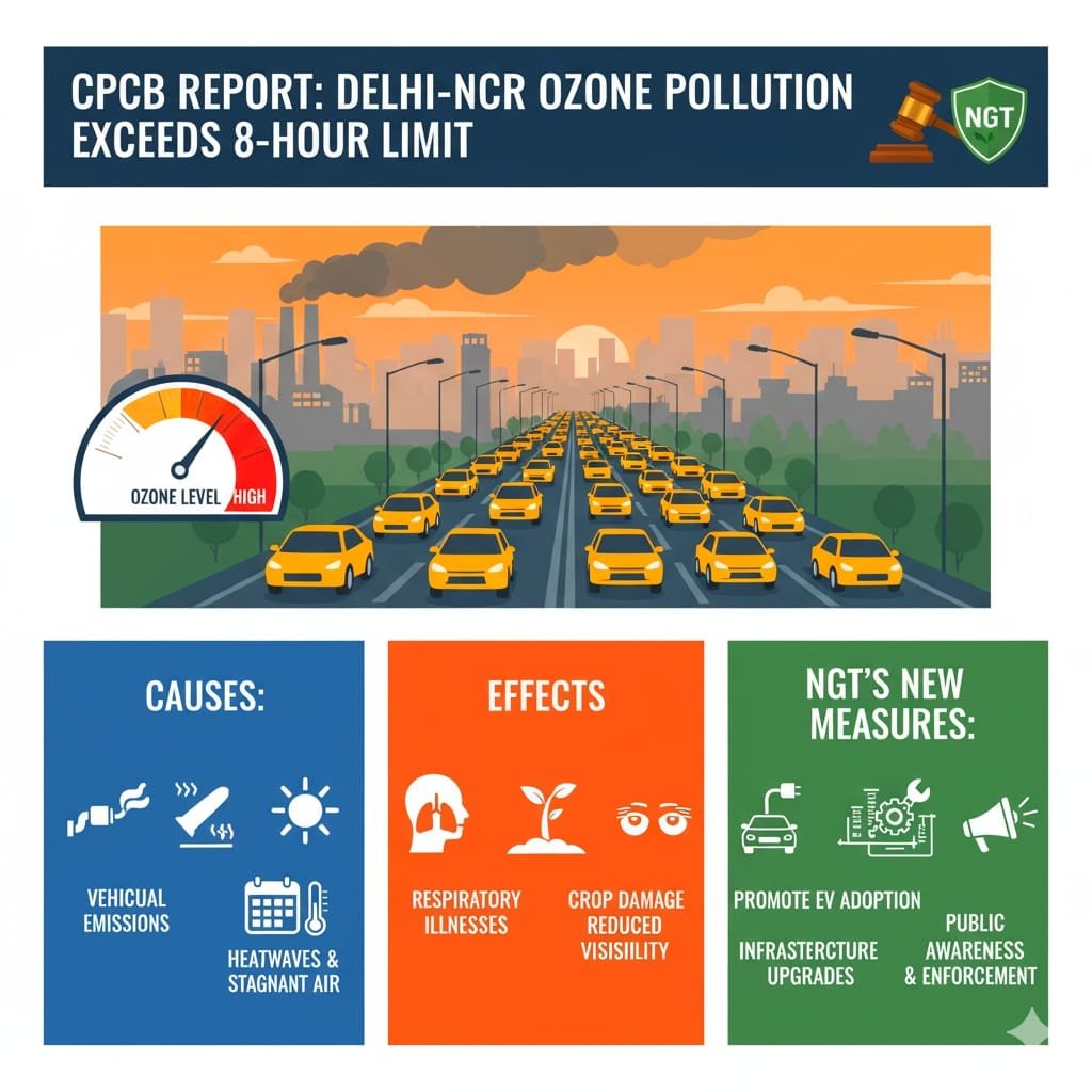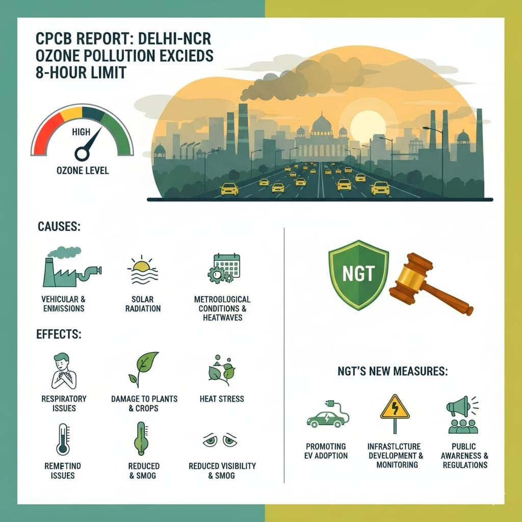 CPCB की रिपोर्ट के अनुसार दिल्ली-NCR में ओज़ोन प्रदूषण 8 घंटे की सीमा से ऊपर पहुंचा। जानें इसके कारण, प्रभाव और NGT के नए कदम।