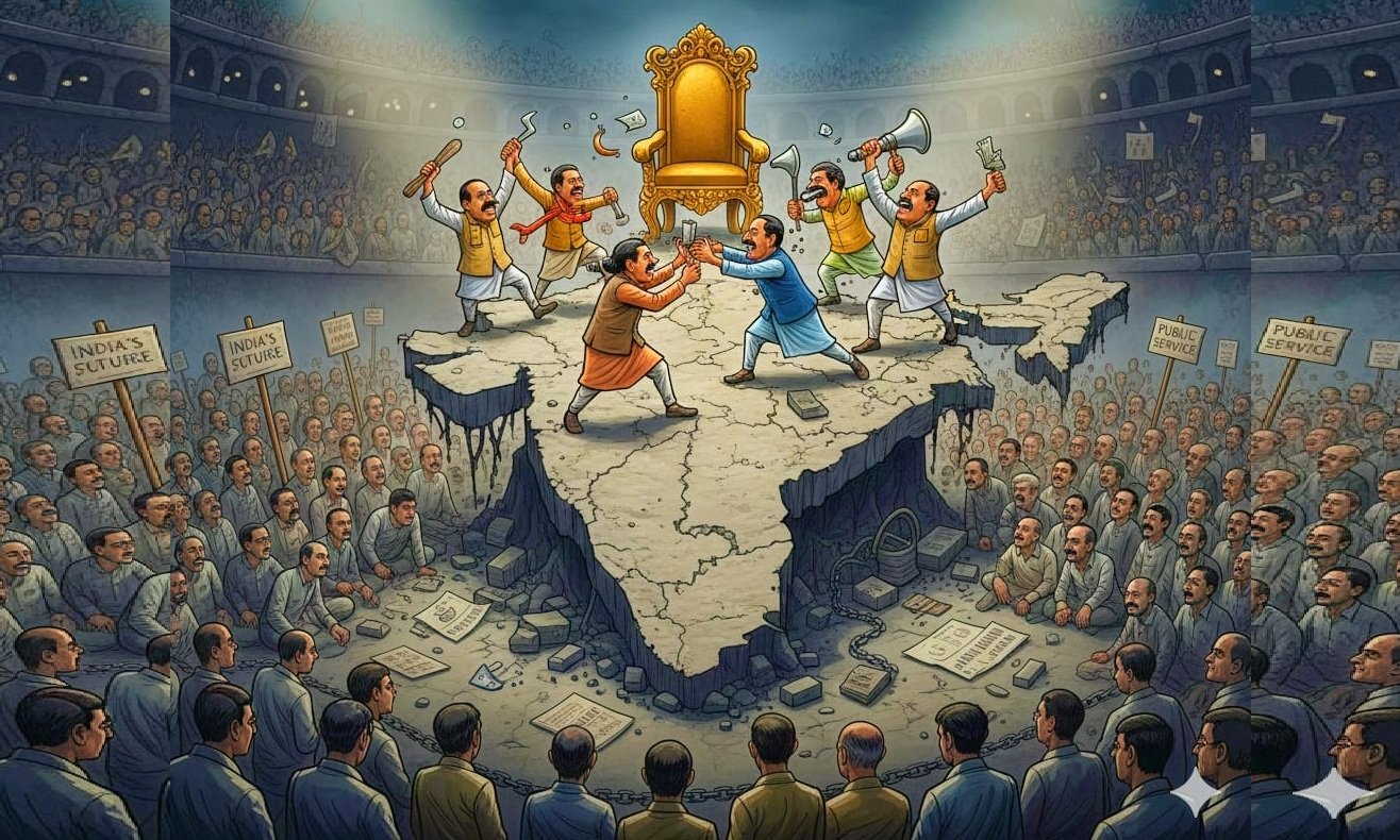 यह देश जहां पहले कृषि, संस्कृति और कर्म सर्वोपरि थे, आज वहां “कुर्सी, कैंडिडेट और कैमरा” सर्वोच्च हैं। हर नेता अपने भाषणों में जनता के दुख-दर्द की बातें करता है, लेकिन चुनाव के बाद वही जनता रोड के गड्ढों और बिलों में गुम हो जाती है। भारतीय राजनीति अब सेवा का नहीं, सत्ता का बाजार बन चुकी है — जहाँ जनता “ग्राहक” है और नेता “विक्रेता”। राजनीति का स्तर गिर नहीं रहा, बल्कि ज़मीन के नीचे जाकर बंकर बन चुका है।