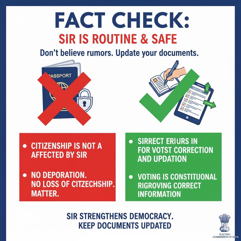 SIR एक बेहद सामान्य और नियमित प्रक्रिया है, जो हर साल देश में चुनाव व्यवस्थाओं को मजबूत और पारदर्शी बनाने के लिए की जाती है। इससे किसी नागरिक को नुकसान नहीं होता और न ही यह कोई सुरक्षा या नागरिकता का मामला है। लोग अफवाहों पर भरोसा न करें और अपने दस्तावेज़ अपडेट रखें।